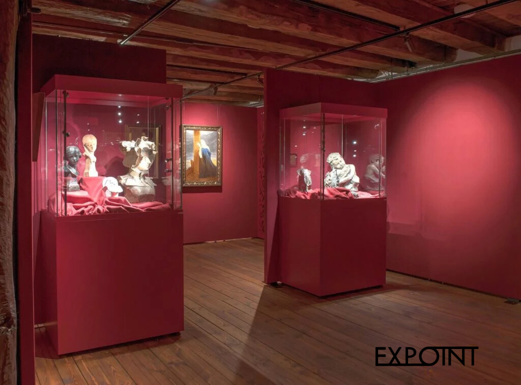 - Vitrine mit verglastem Korpus ohne vertikale Metallprofile, wodurch die ausgestellten Objekte vollständig sichtbar sind