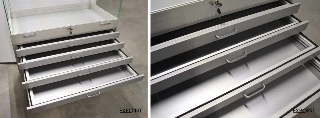 - Der Sockel kann mit maßgefertigten Schubladen für weitere Exponate ausgestattet werden.