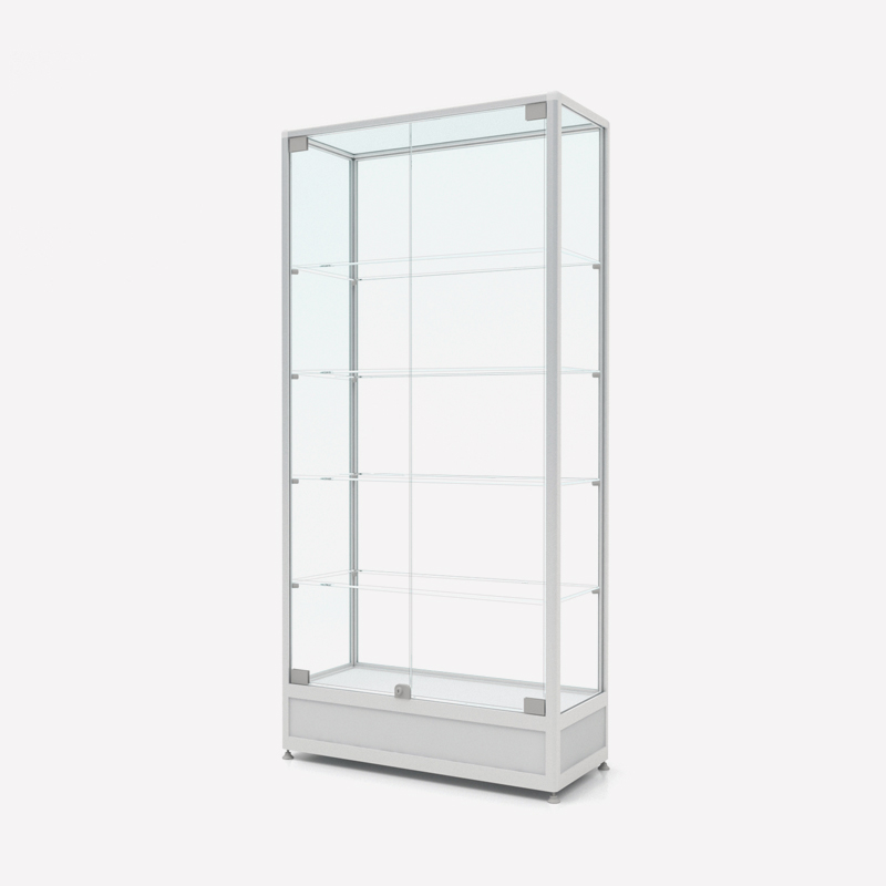 Der Sockel ist ein großer Vorteil dieser Vitrine. Er schützt das Glas vor Bruch, z. B. beim Reinigen, und verstärkt gleichzeitig die gesamte Konstruktion. Im Sockel kann die Stromquelle für die Beleuchtung der Vitrine versteckt werden.