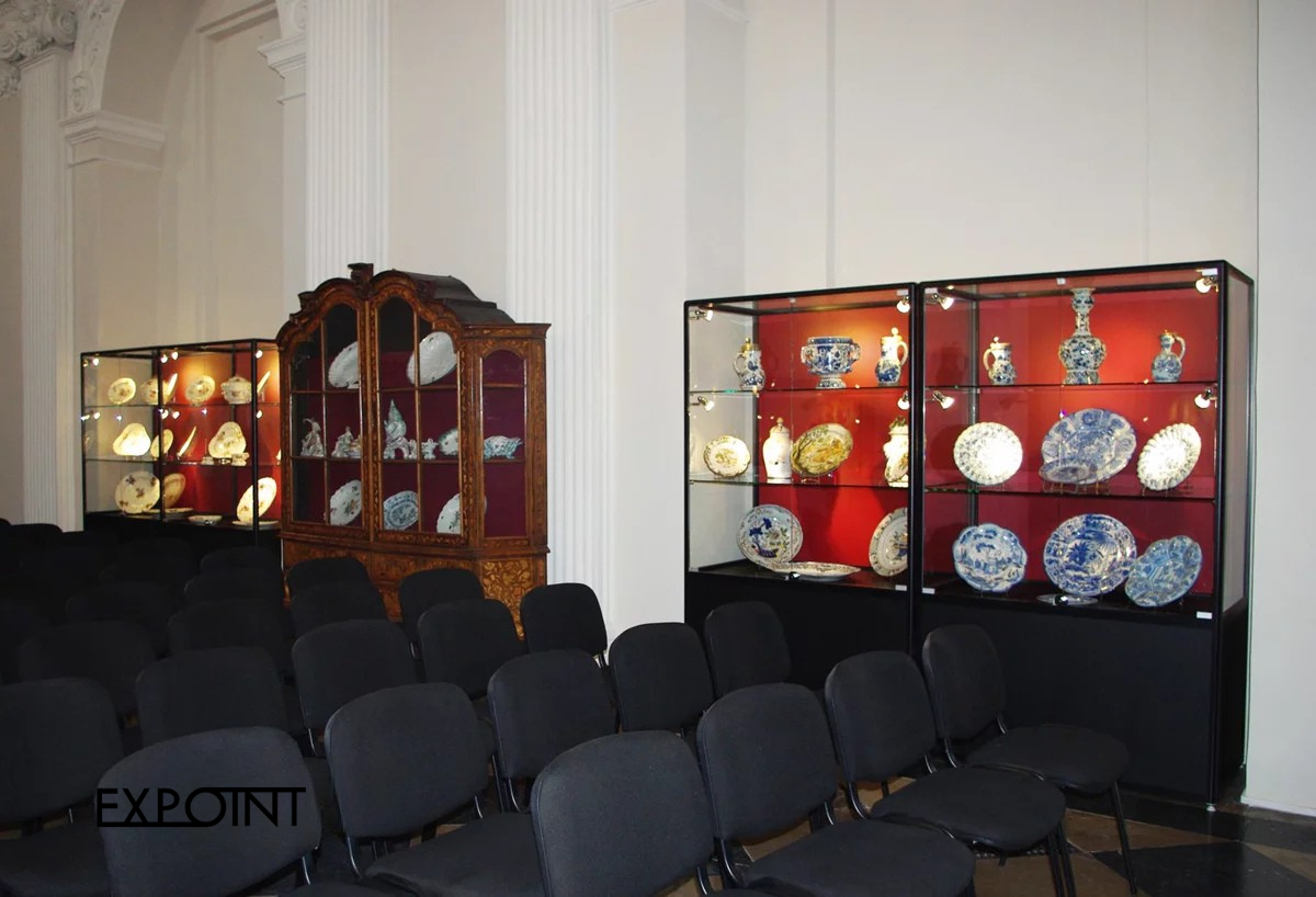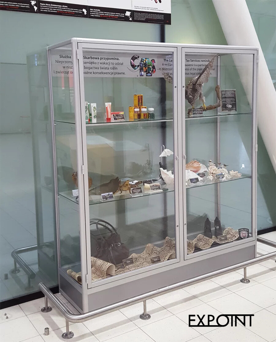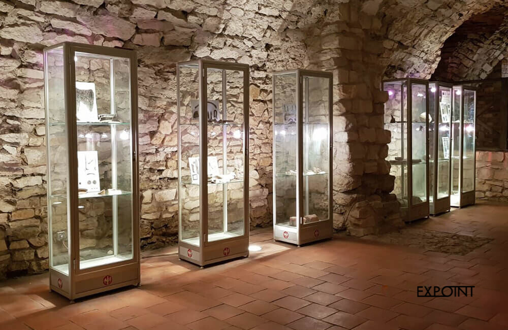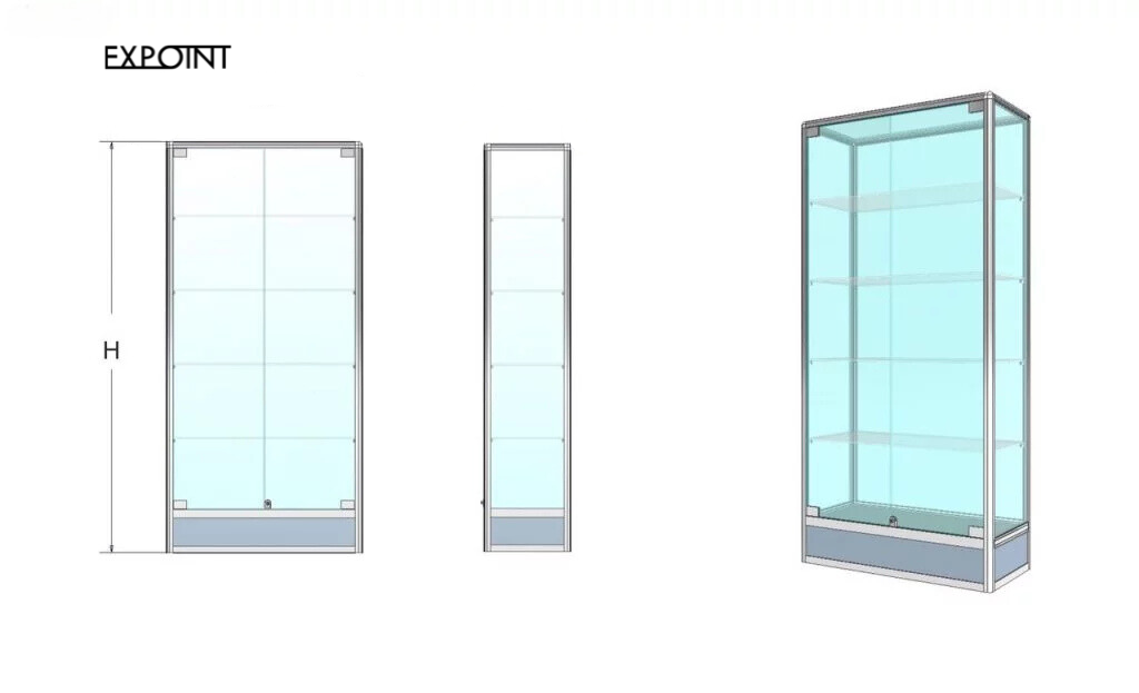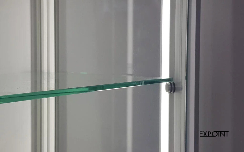 - Glasböden aus gehärtetem Glas, dessen Dicke dem Gewicht der ausgestellten Gegenstände entspricht; in den meisten Fällen werden die Böden aus 5 mm, 6 mm oder 8 mm Glas hergestellt.